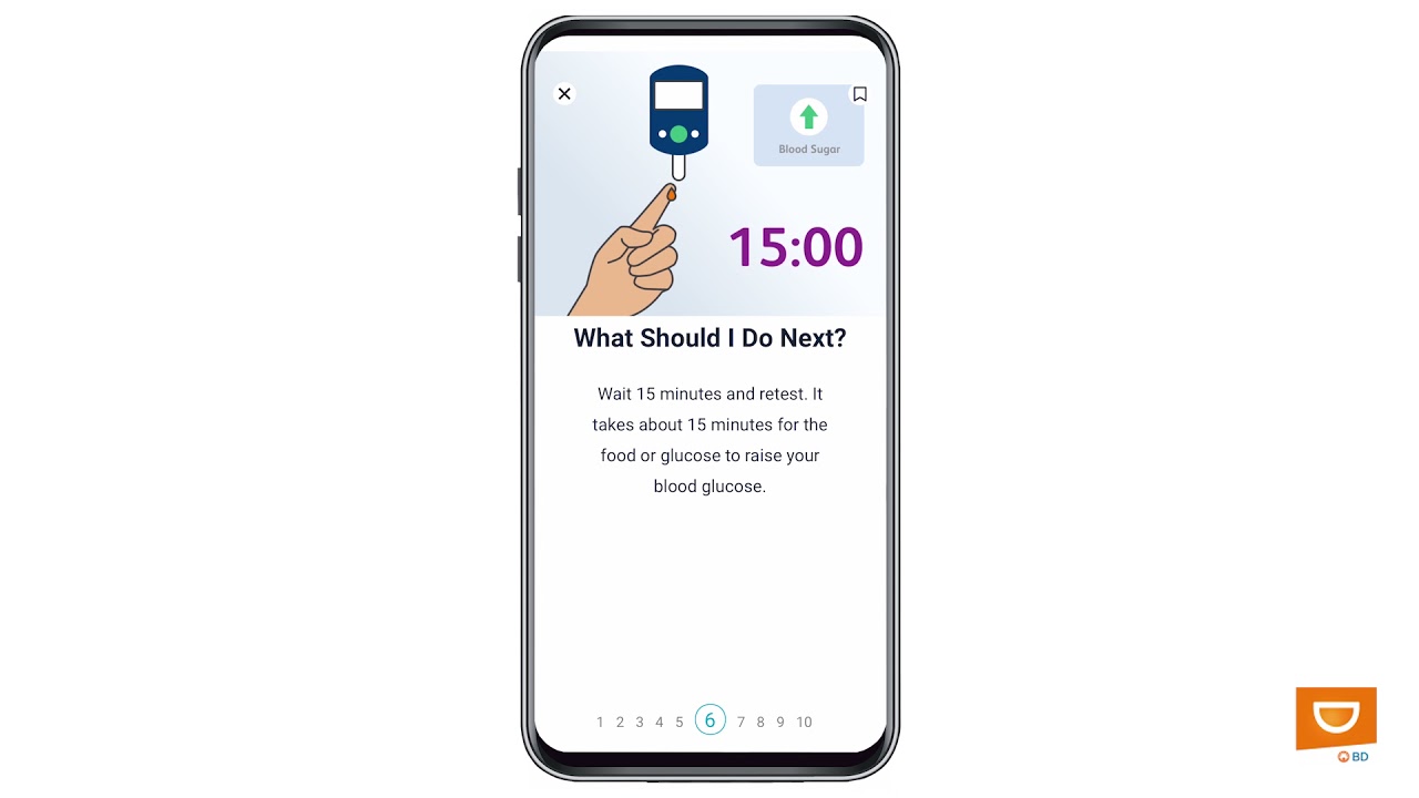 This short tutorial, available in the BD™ Diabetes Care App, explains what hypoglycemia is, the most common signs and symptoms and recommendations from the ADA on how to treat it. You will be able to advance the screens at a pace that is comfortable to you.